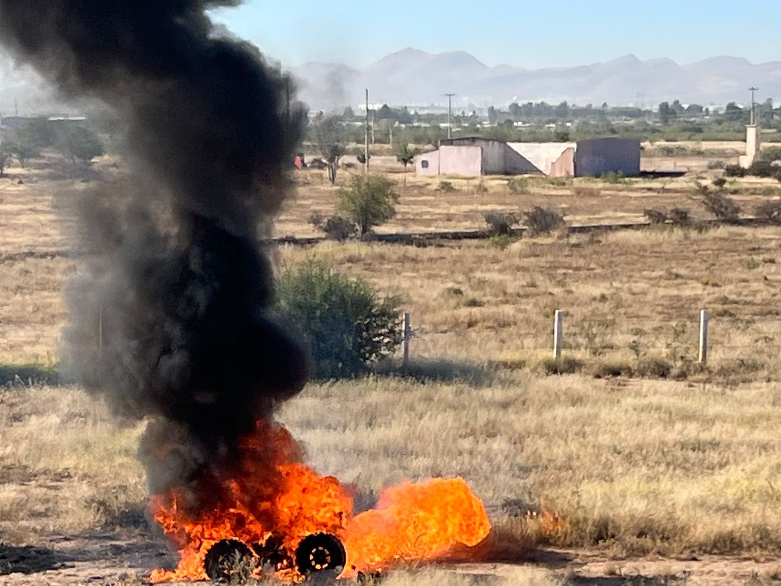 Chihuahua, Chih.— Una cuatrimoto de alta gama quedó completamente calcinada la mañana de este jueves sobre el Nuevo Libramiento Oriente, a la altura del kilómetro 36, en el tramo correspondiente al Ejido Sacramento.