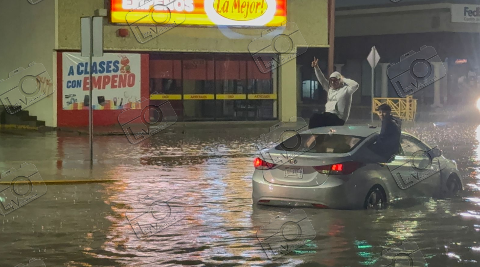 Ciudad Juárez, Chih.— Las fuertes lluvias registradas la noche de este sábado provocaron encharcamientos en distintos puntos de la ciudad, entre ellos el cruce de la avenida López Mateos y Óscar Flores.