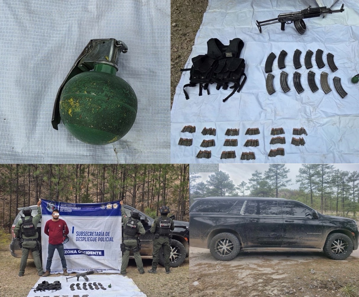 Urique, Chih.– Elementos de la Policía del Estado detuvieron a un hombre en el municipio de Urique, a quien se le aseguró un arma de fuego larga, una granada, equipo táctico y un vehículo con reporte de robo en Estados Unidos.