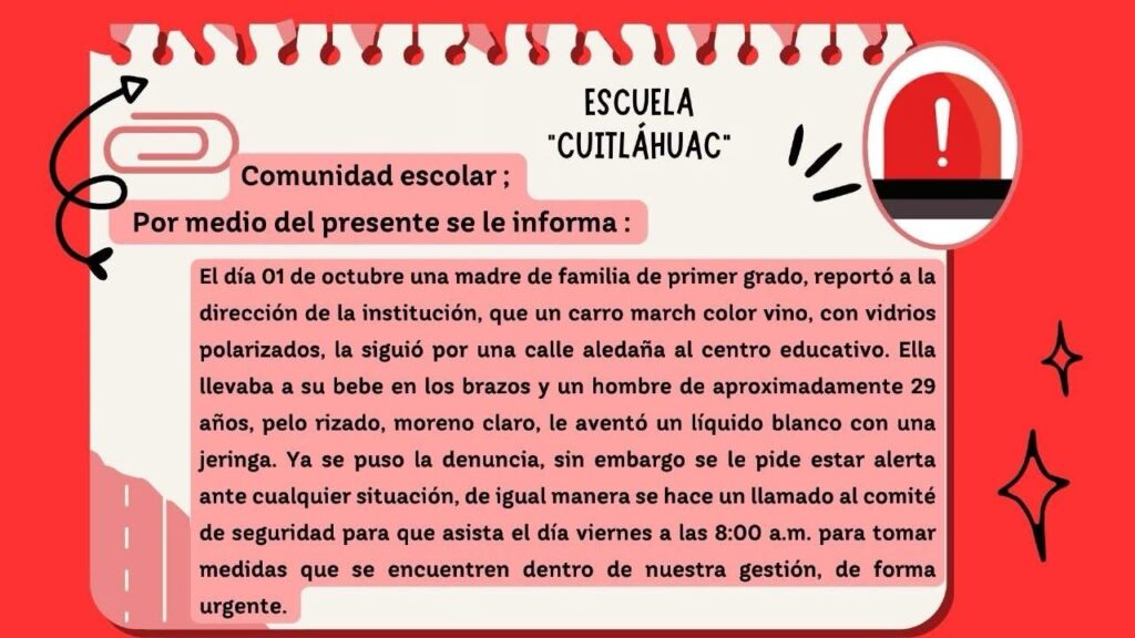 El hecho habría ocurrido a plena luz del día, en las inmediaciones de la primaria Cuitláhuac, por lo que la denunciante pidió a los padres de familia extremar precauciones.