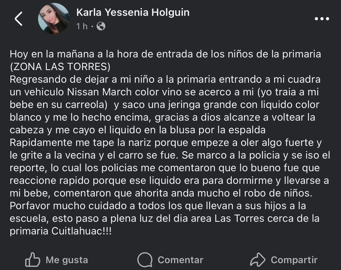 De acuerdo con el testimonio, un vehículo Nissan March color vino se le acercó y uno de los ocupantes habría arrojado sobre ella un líquido blanco desde una jeringa. La mujer relató que alcanzó a girar la cabeza y el líquido le cayó en la blusa, mientras cargaba a su bebé en una carreola.