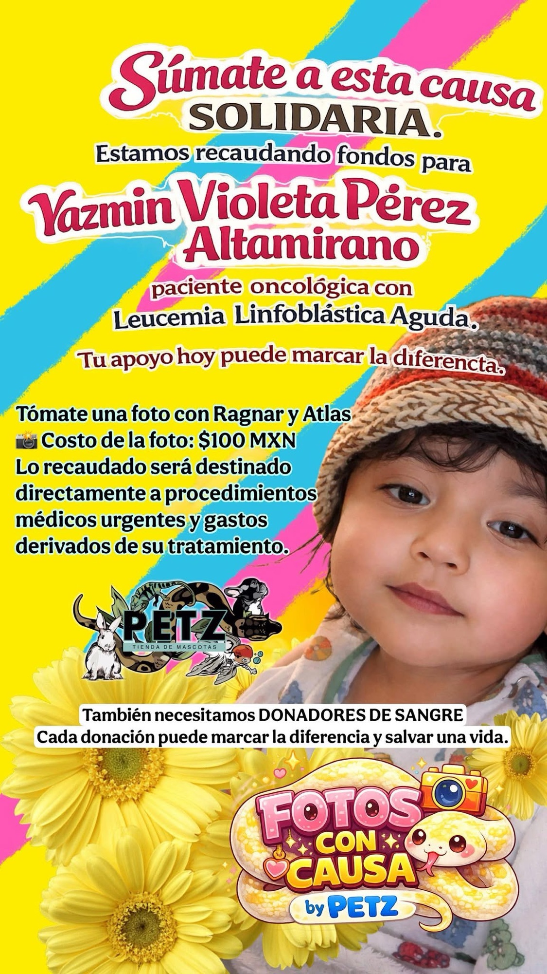 Con el objetivo de recaudar fondos para gastos médicos urgentes, se lanzó la iniciativa “Fotos con causa en PETZ”, un proyecto solidario que invita a la comunidad, especialmente a los dealers reptileros, a sumarse en apoyo de Yazmín Violeta Pérez Altamirano, paciente oncológica internada en el Hospital Infantil.