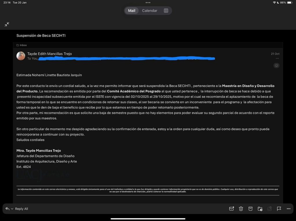 La joven explicó que es egresada de la Licenciatura en Diseño de Interiores por la UACJ-IADA, generación 2015, y que tras casi una década de experiencia laboral decidió regresar a su alma máter para cursar una maestría, motivada por su interés en la investigación y el desarrollo académico. Sin embargo, aseguró que durante este proceso enfrentó hechos que calificó como violencia, abuso, negligencia y desfachatez institucional.