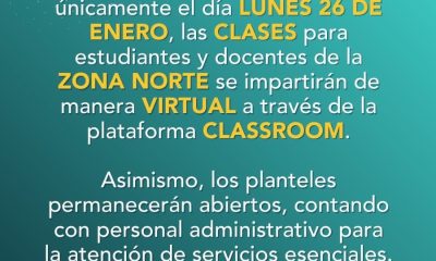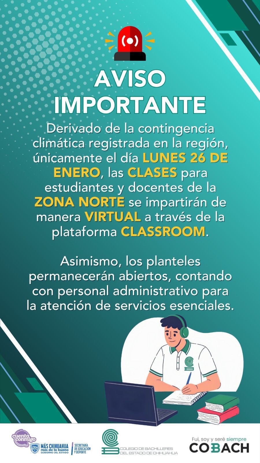 Ciudad Juárez.- Autoridades educativas informaron que, derivado de la contingencia climática registrada en la región, únicamente este lunes 26 de enero las clases para estudiantes y docentes de la Zona Norte se impartirán de manera virtual a través de la plataforma Classroom.