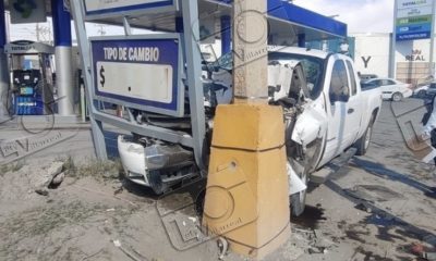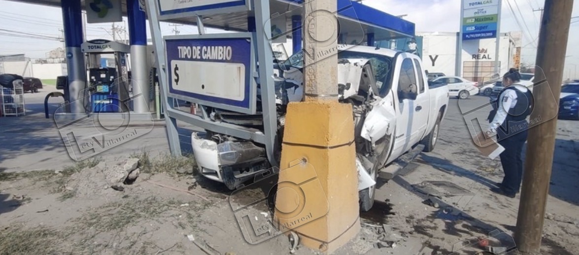 Ciudad Juárez, Chih. – La mañana de este jueves se registró un accidente vial sobre la avenida Miguel de la Madrid, a la altura de una conocida gasolinera frente al salón Los Pinos, donde una camioneta Silverado blanca se impactó contra un poste y la base de un anuncio.