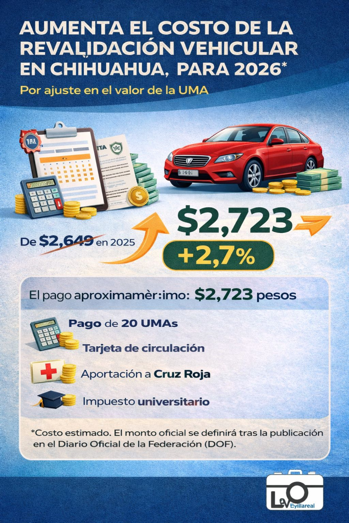 Ciudad Juárez, Chih.– El costo de la revalidación vehicular en Chihuahua para el año 2026 podría registrar un incremento aproximado del 2.7 por ciento, derivado del ajuste anual a la Unidad de Medida y Actualización (UMA), indicador que sirve como base para el cobro de este derecho.